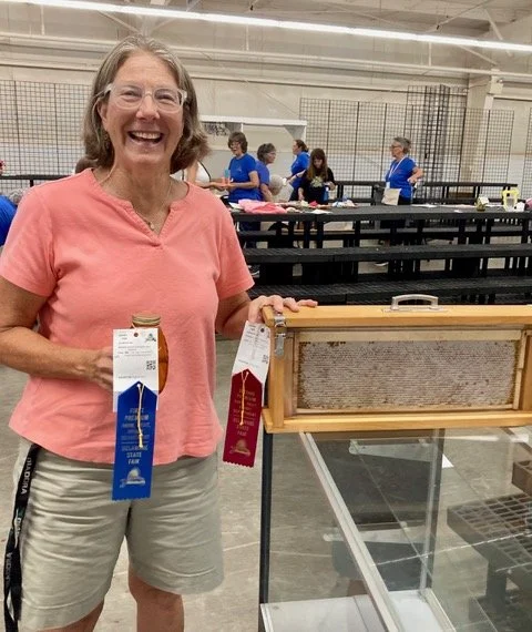 We’re happy to congratulate LBC member Pam Hepp on her multiple wins at the 2025 DE State Fair! A home-apiarist with 8 hives, Pam won the Memorial Beekeeper award for the "Best in Show" honey. The honey won its color class (amber) and then was selected as the winner of all 4 color classes -- dark, amber, light amber, and light. AND... Pam also garnered a second place ribbon for a honey frame submission. She noted, "The governor was a terrific guy, interested in how both the bees and beekeepers are doing." Congratulations, Pam!